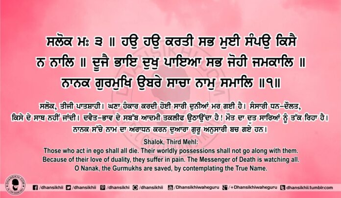 ਦਵੈਤ-ਭਾਵ ਦੇ ਸਬੱਬ ਆਦਮੀ ਤਕਲੀਫ ਉਠਾਉਂਦਾ ਹੈ! ਮੌਤ ਦਾ ਦੂਤ ਸਾਰਿਆਂ ਨੂੰ ਤੱਕ ਰਿਹਾ ਹੈ।