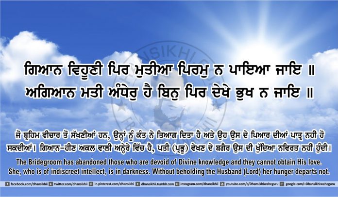 ਅਗਿਆਨ ਮਤੀ ਅੰਧੇਰੁ ਹੈ ਬਿਨੁ ਪਿਰ ਦੇਖੇ ਭੁਖ ਨ ਜਾਇ ॥