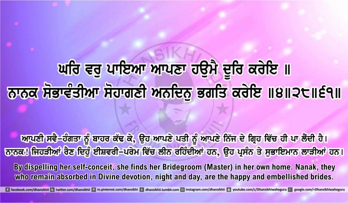 ਘਰਿ ਵਰੁ ਪਾਇਆ ਆਪਣਾ ਹਉਮੈ ਦੂਰਿ ਕਰੇਇ ॥