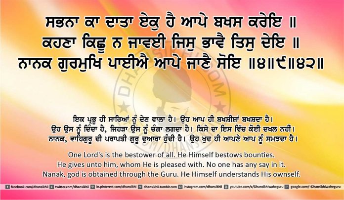 ਸਭਨਾ ਕਾ ਦਾਤਾ ਏਕੁ ਹੈ ਆਪੇ ਬਖਸ ਕਰੇਇ ॥