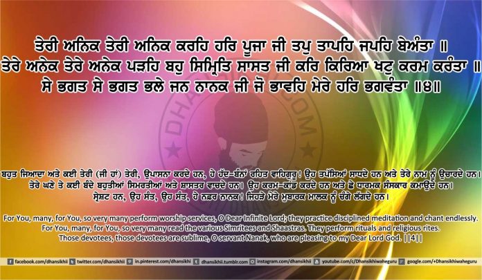 ਤੇਰੇ ਅਨੇਕ ਤੇਰੇ ਅਨੇਕ ਪੜਹਿ ਬਹੁ ਸਿਮ੍ਰਿਤਿ ਸਾਸਤ ਜੀ ਕਰਿ ਕਿਰਿਆ ਖਟੁ ਕਰਮ ਕਰੰਤਾ ॥